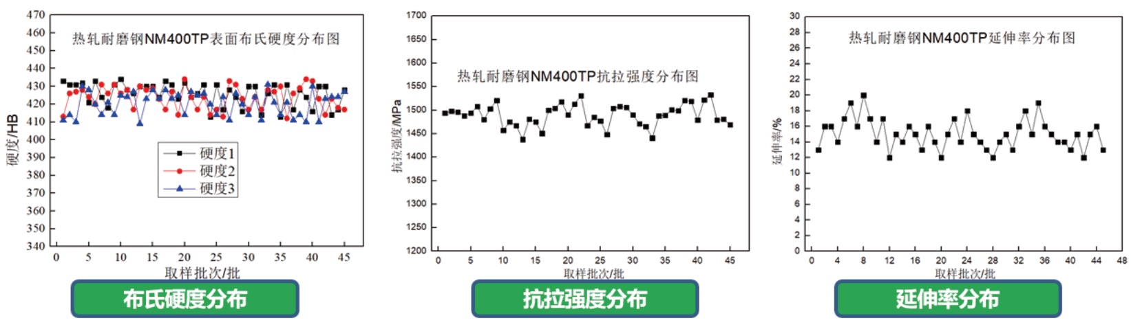 NM400TP性能分布情況(45個批次):布氏硬度高度均勻,波動<±15HBW,均勻磨損,保證使用壽命。抗拉強度≥1400MPa,延伸率>11%,保證馬氏體超高強耐磨鋼的加工、成型性能。